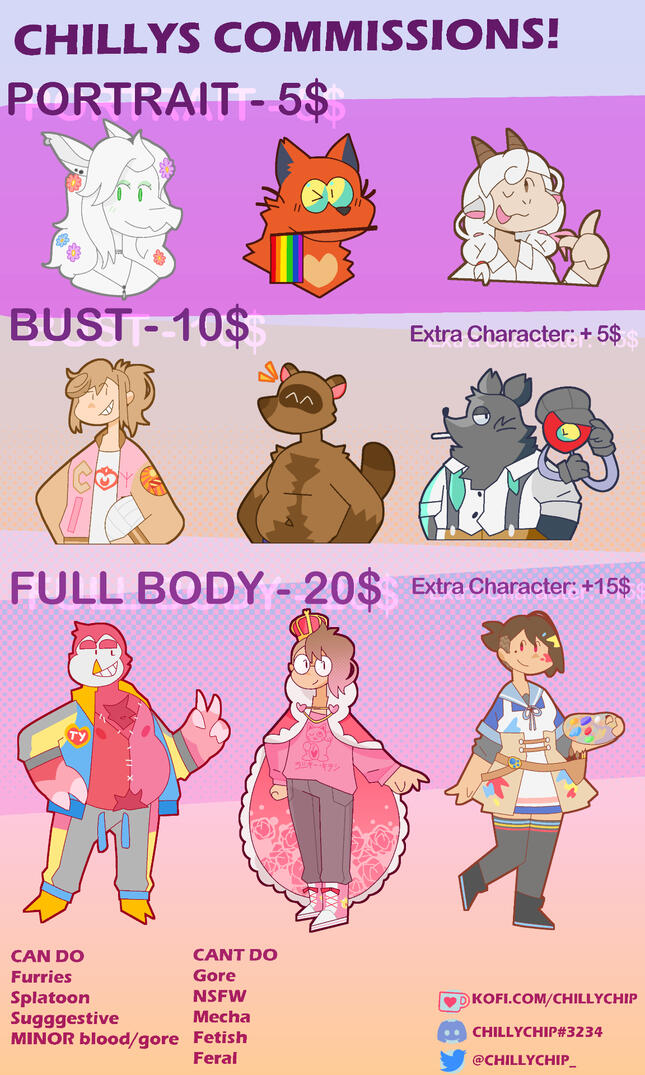 I WON'T draw gore, nsfw, mecha characters, feral characters, anything fetishy, and under no circumstances, nfts.Enough chit chat though. Below are some examples! Please note that the first image is outdated in terms of prices.
